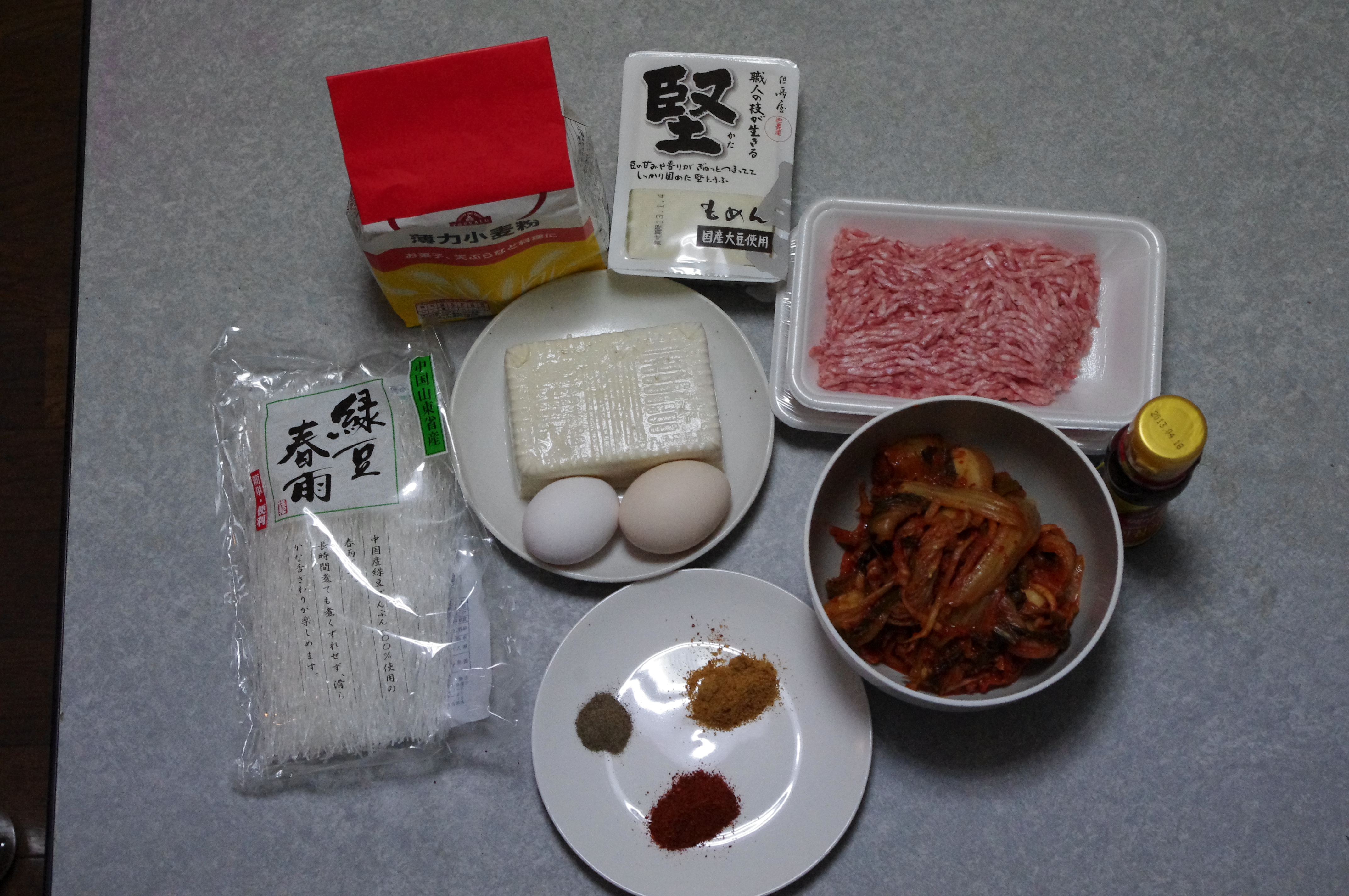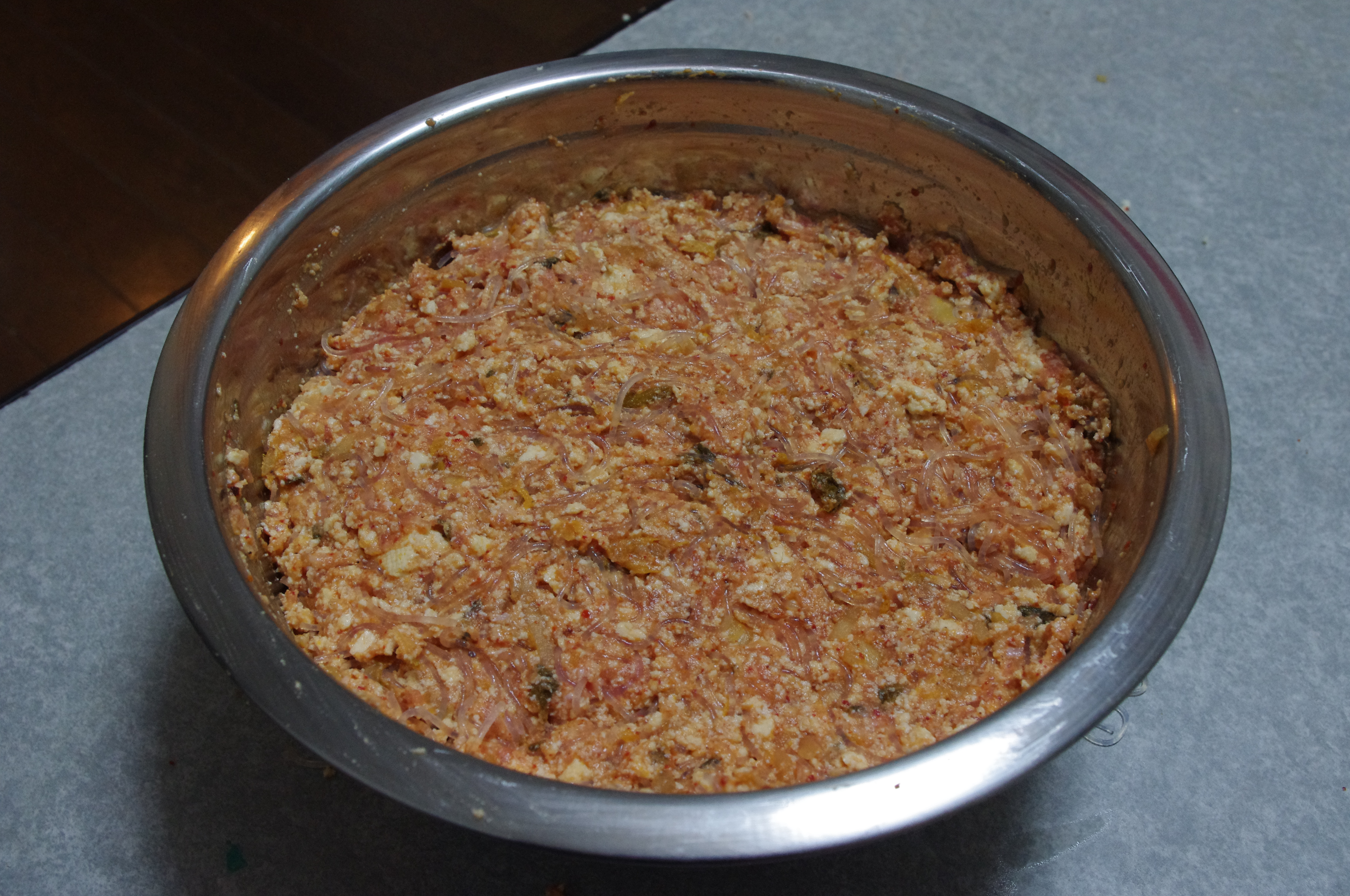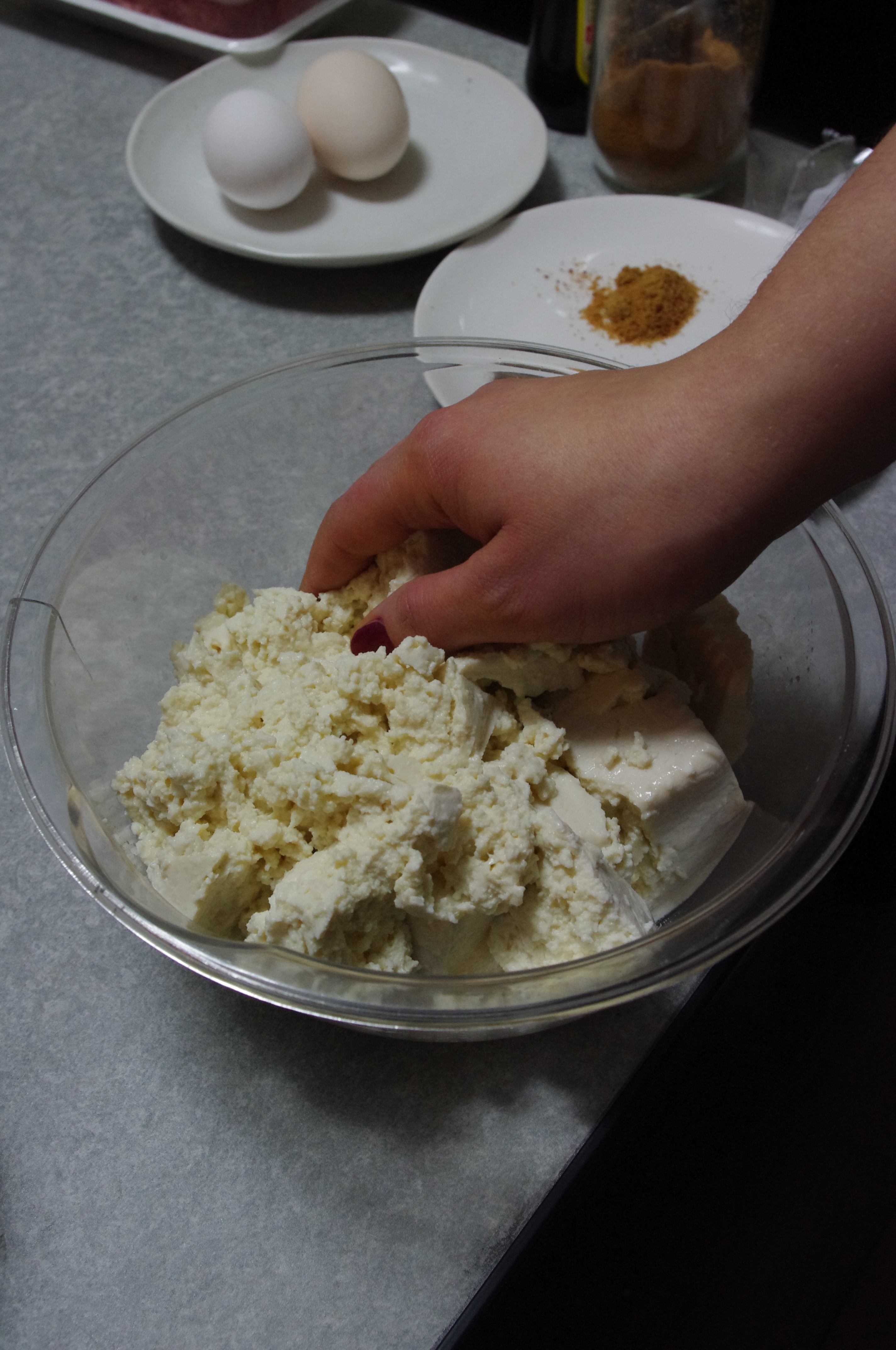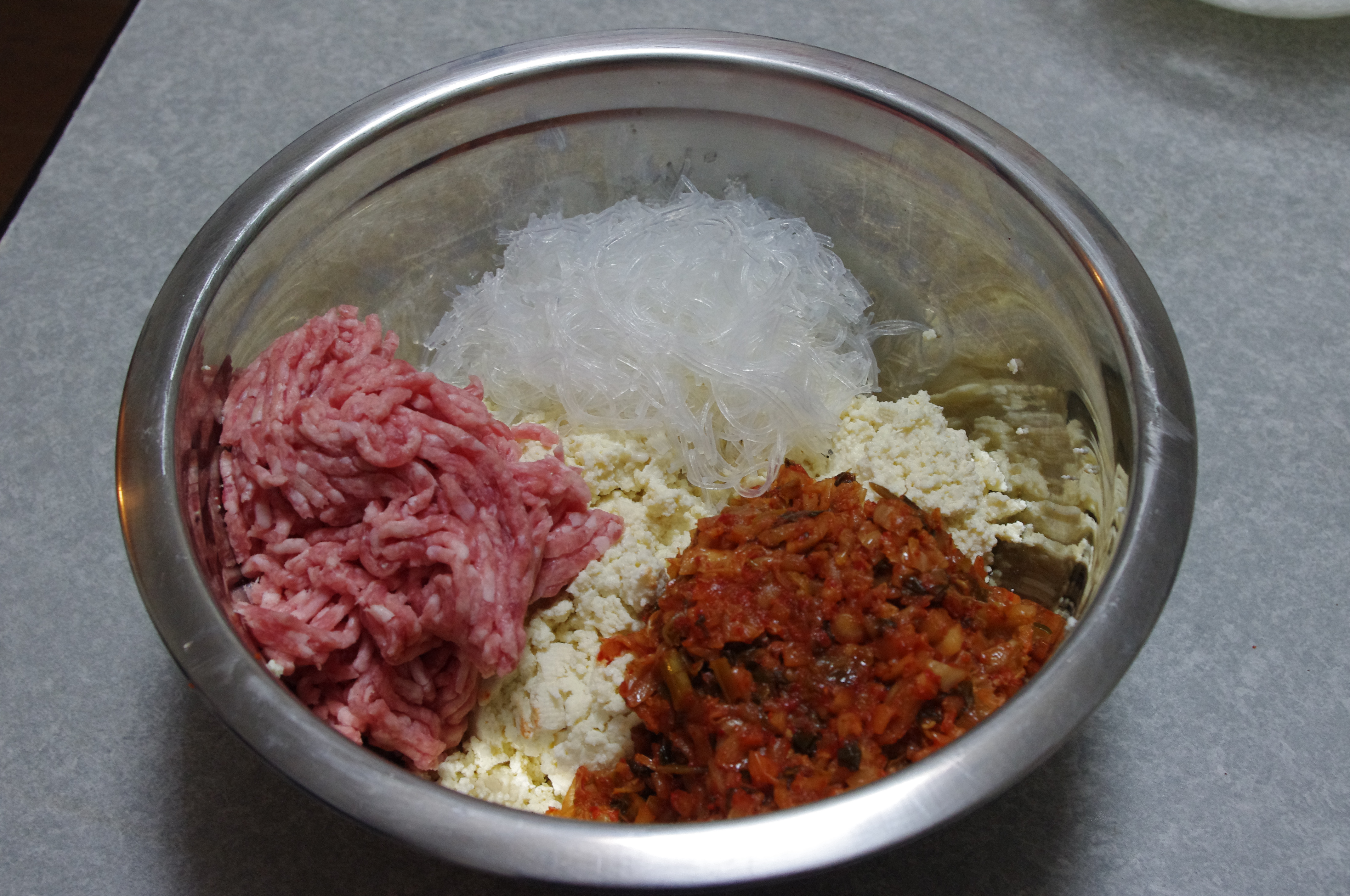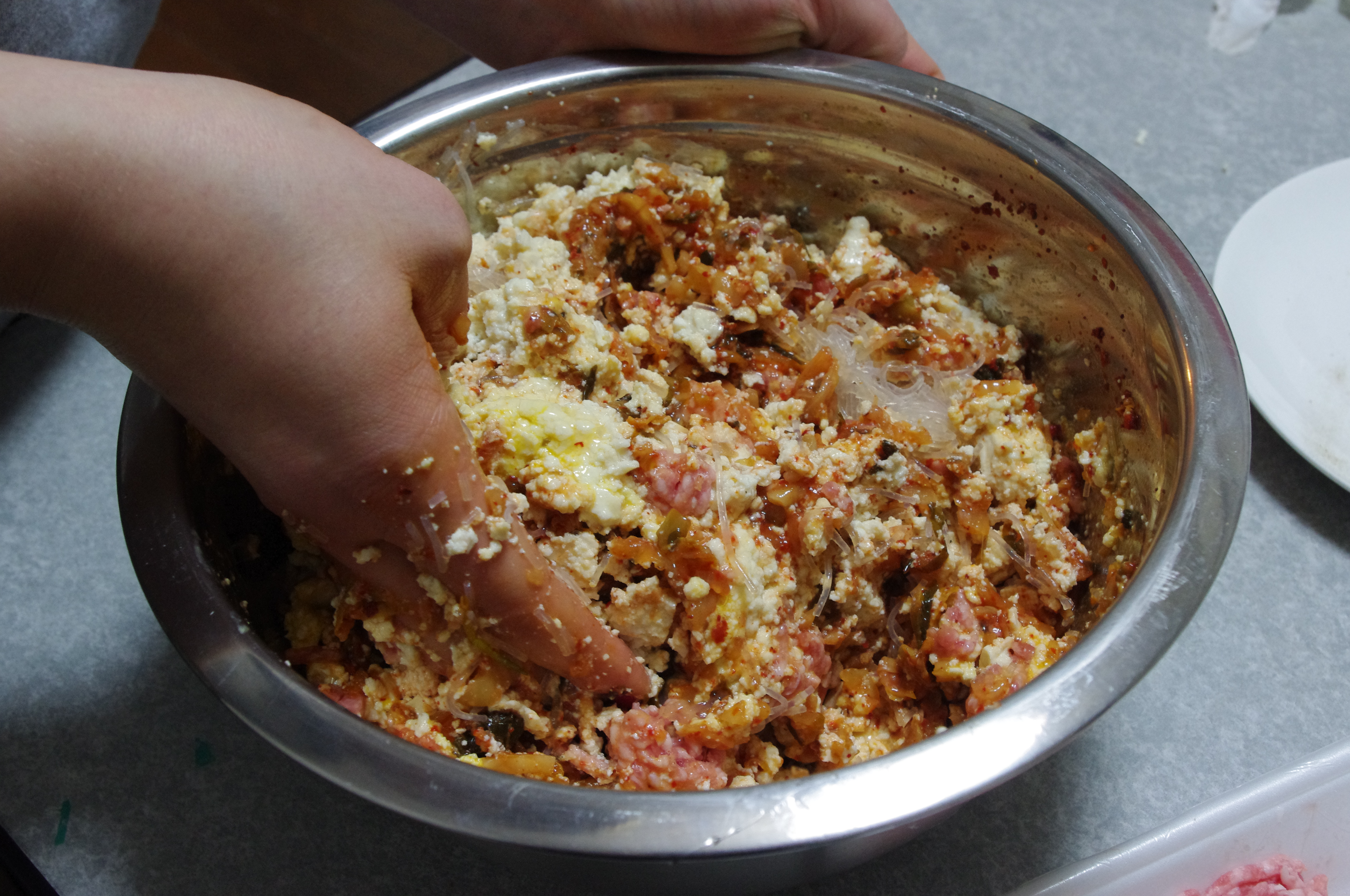 6. In the big bowl mix together: mashed tofu, chopped kimchi, meat (raw!), 2 eggs and spices. There is no rule for spices: add as much as you like.