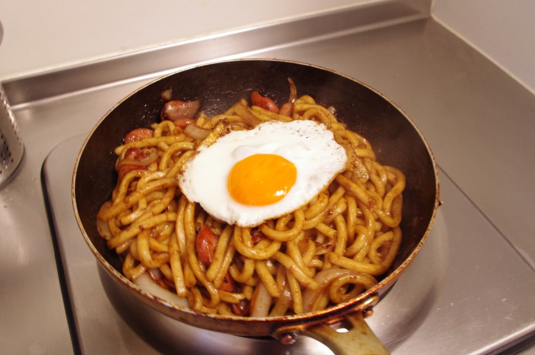 5. Take the egg out from the frying pan. Add the udon noodles. Fry them with onion and sausage for a while. Add yaki soba sauce and fry a little bit longer.