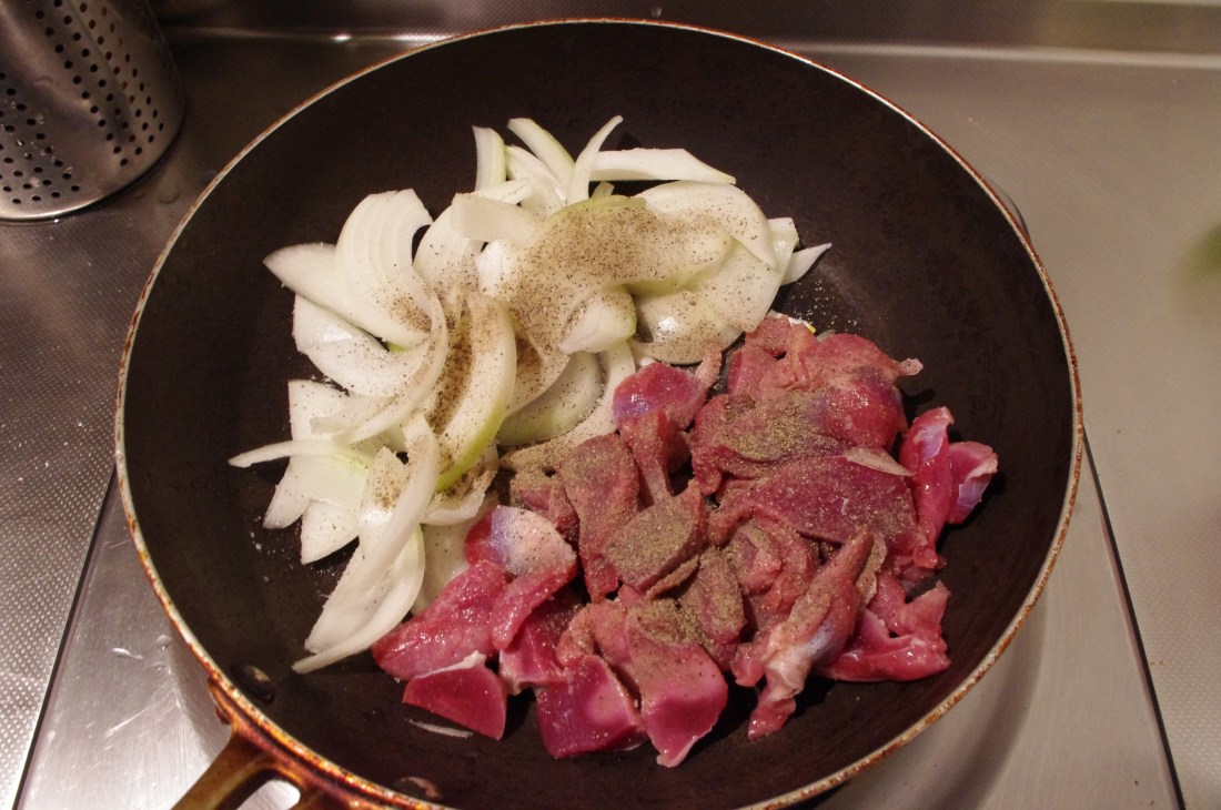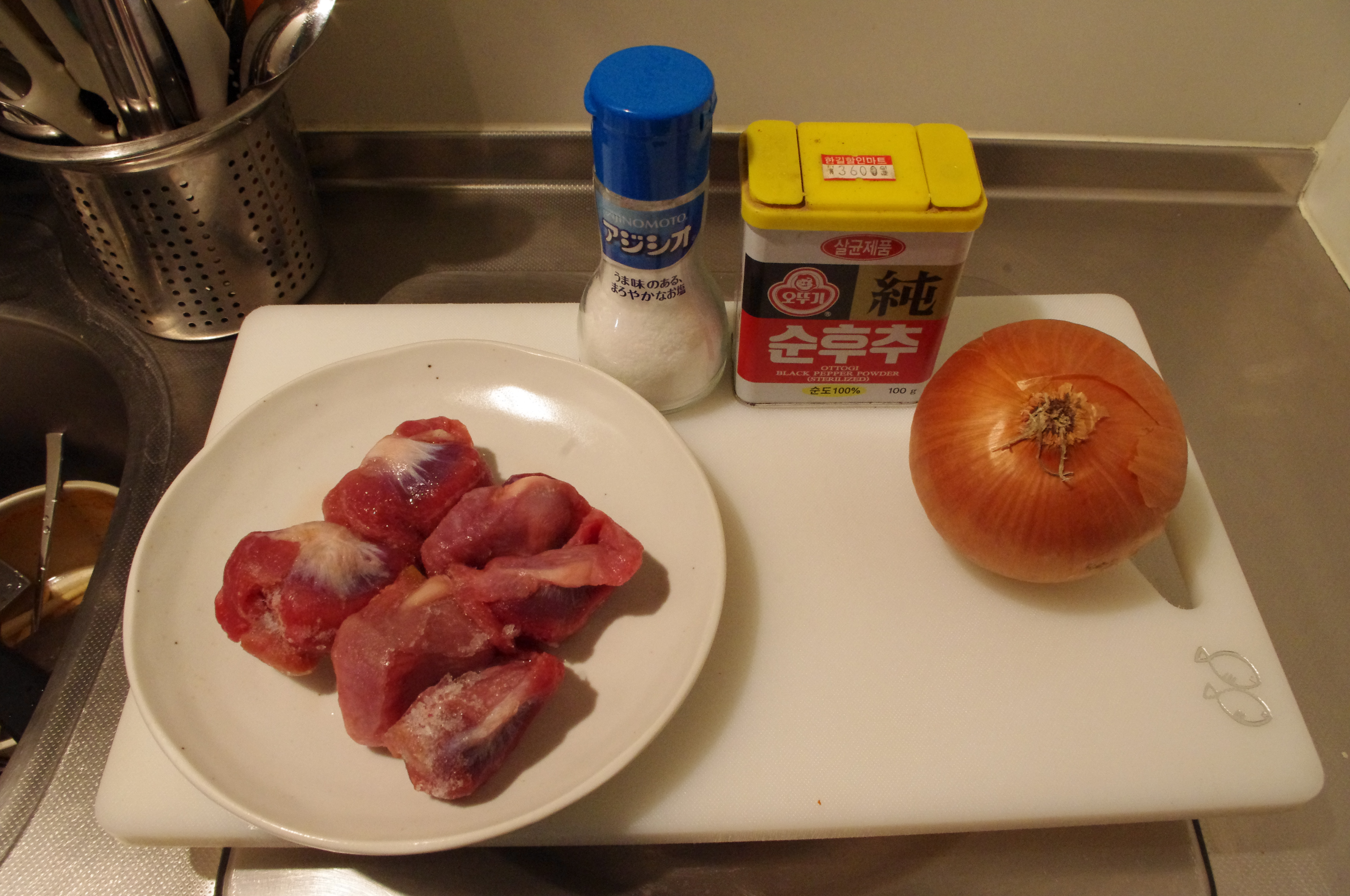 2. Preheat a little bit of oil on the frying pan. When it’s hot, add the chicken stomach, onion, salt, pepper and a little bit of mirin to the frying pan. Fry for a while, stirring from time to time.