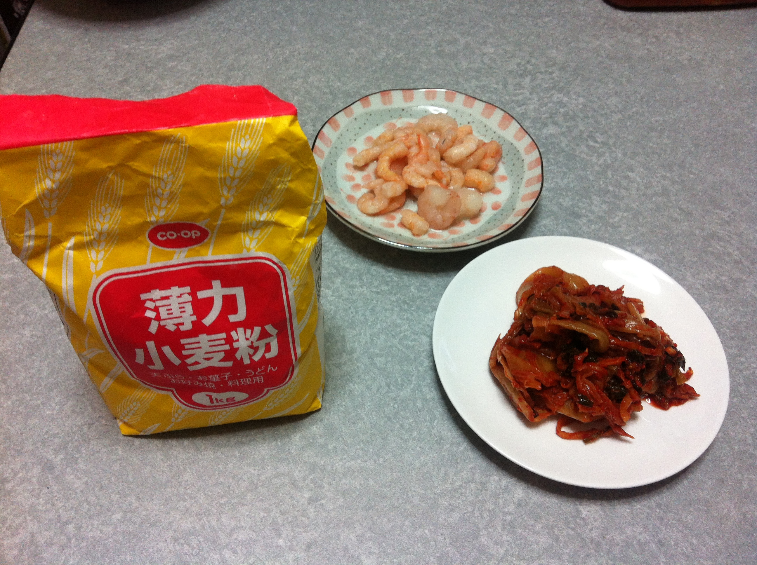 1. In the big bowl mix together: kimchi, flour and shrimps.