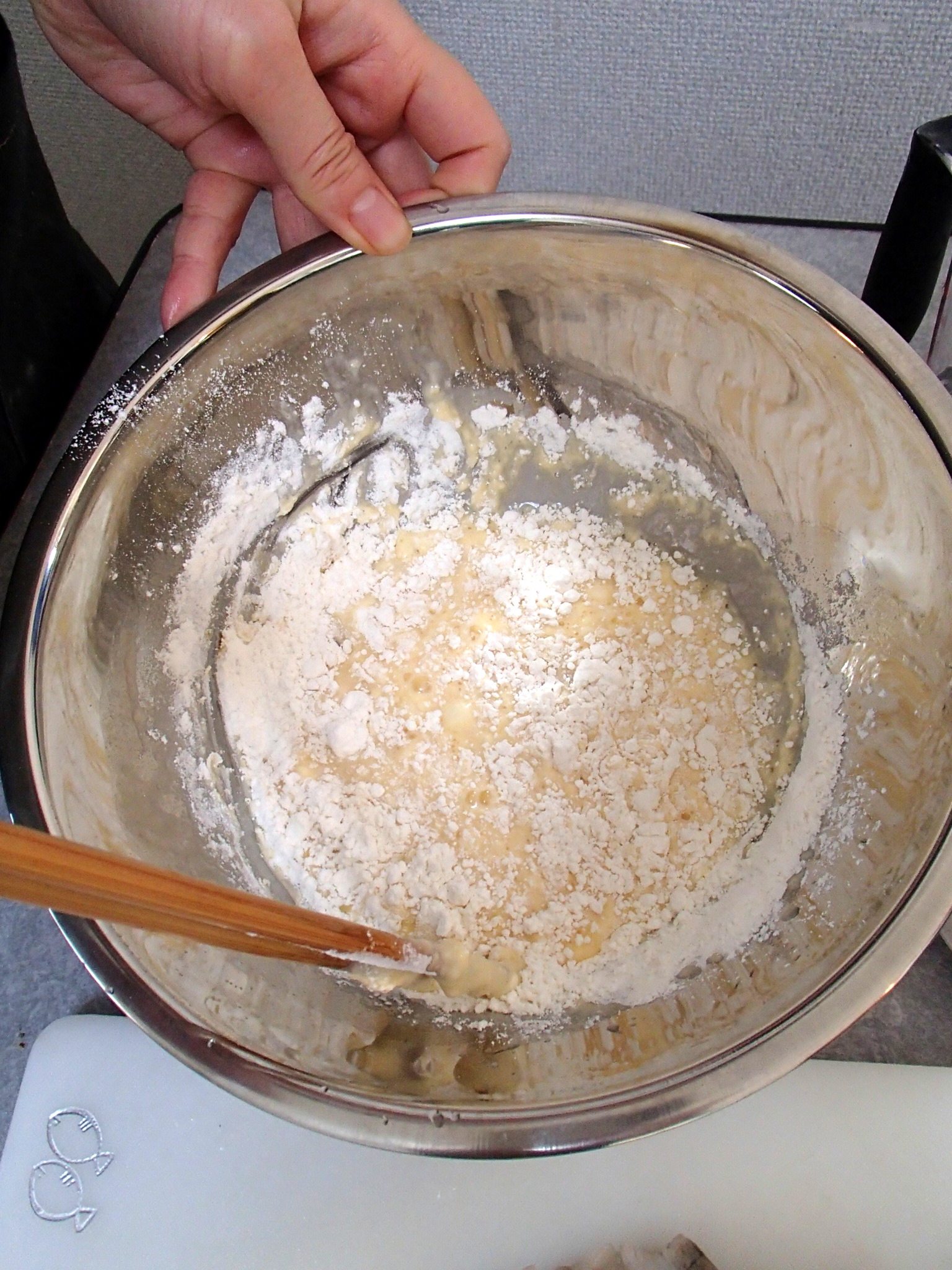 In the end, add the flour. The batter shouldn’t be very well mixed, some lumps are ok ^^