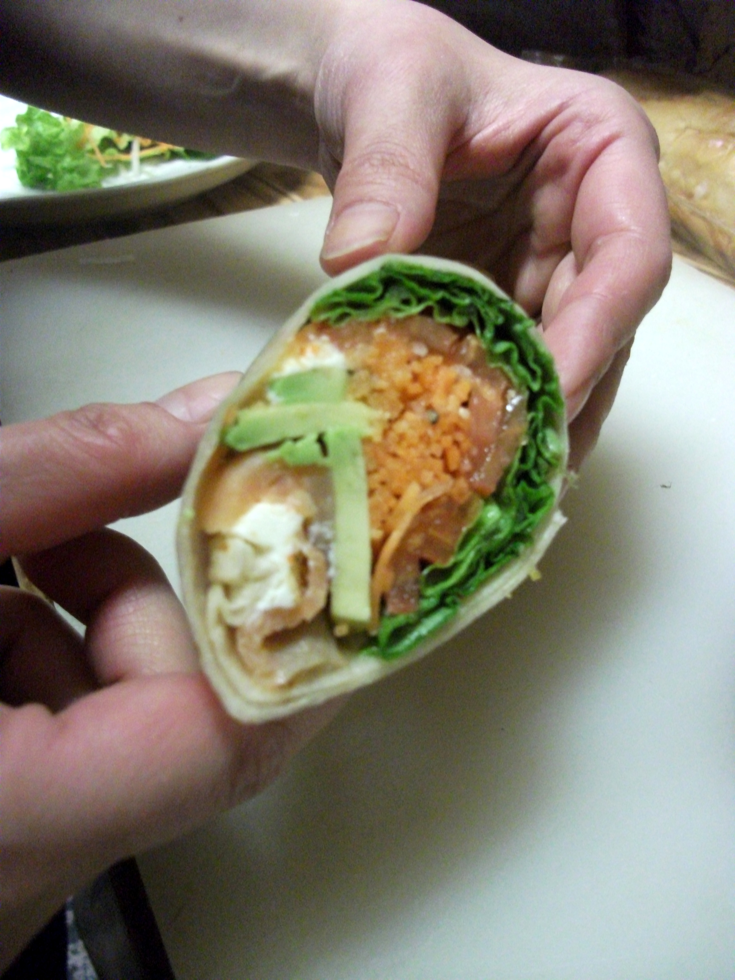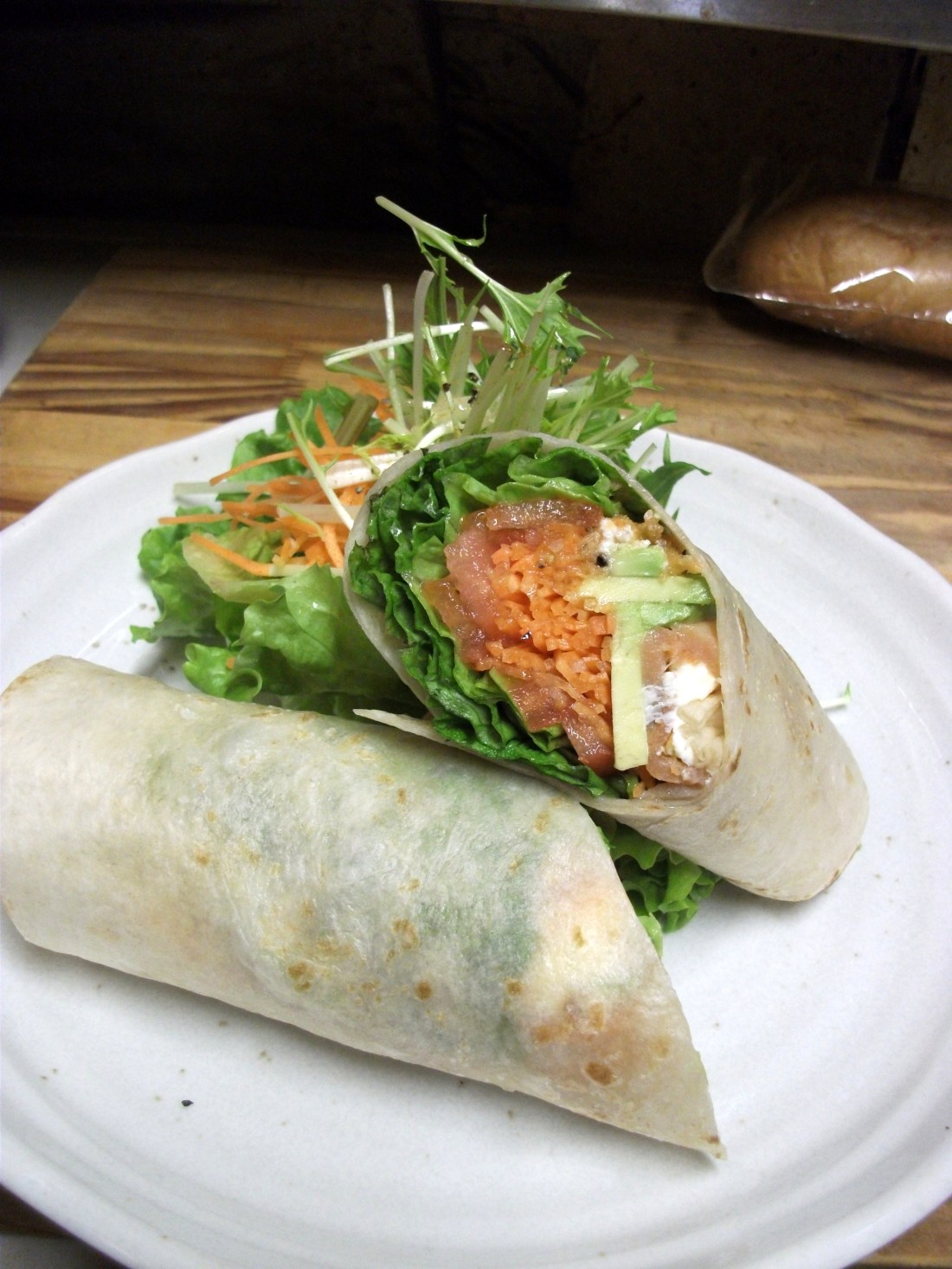 5. Spread cream cheese onto tortilla and move the veggies&salmon on top of cream cheese.You can add some camembert cheese, if you like. Now, roll it up tightly.