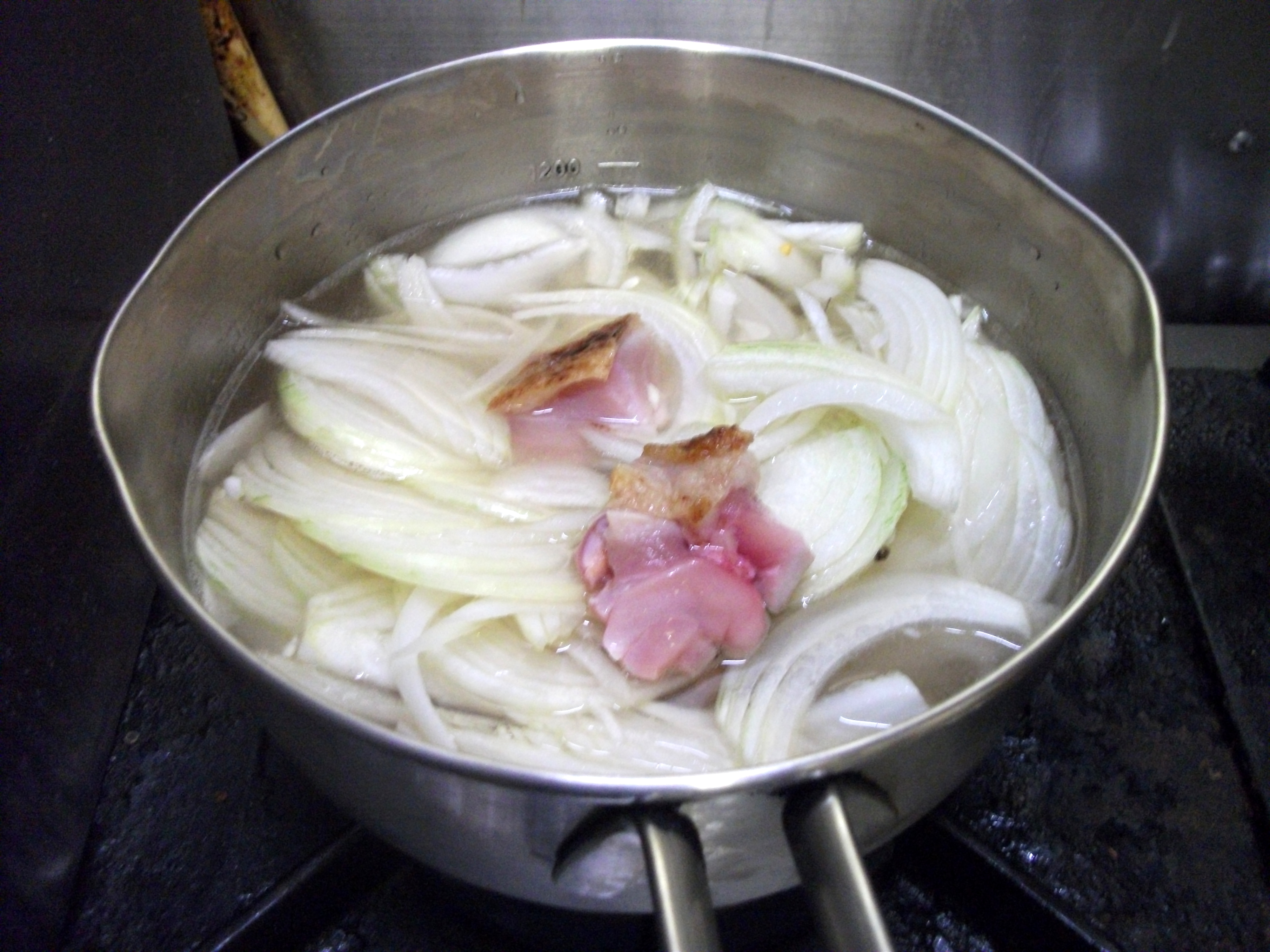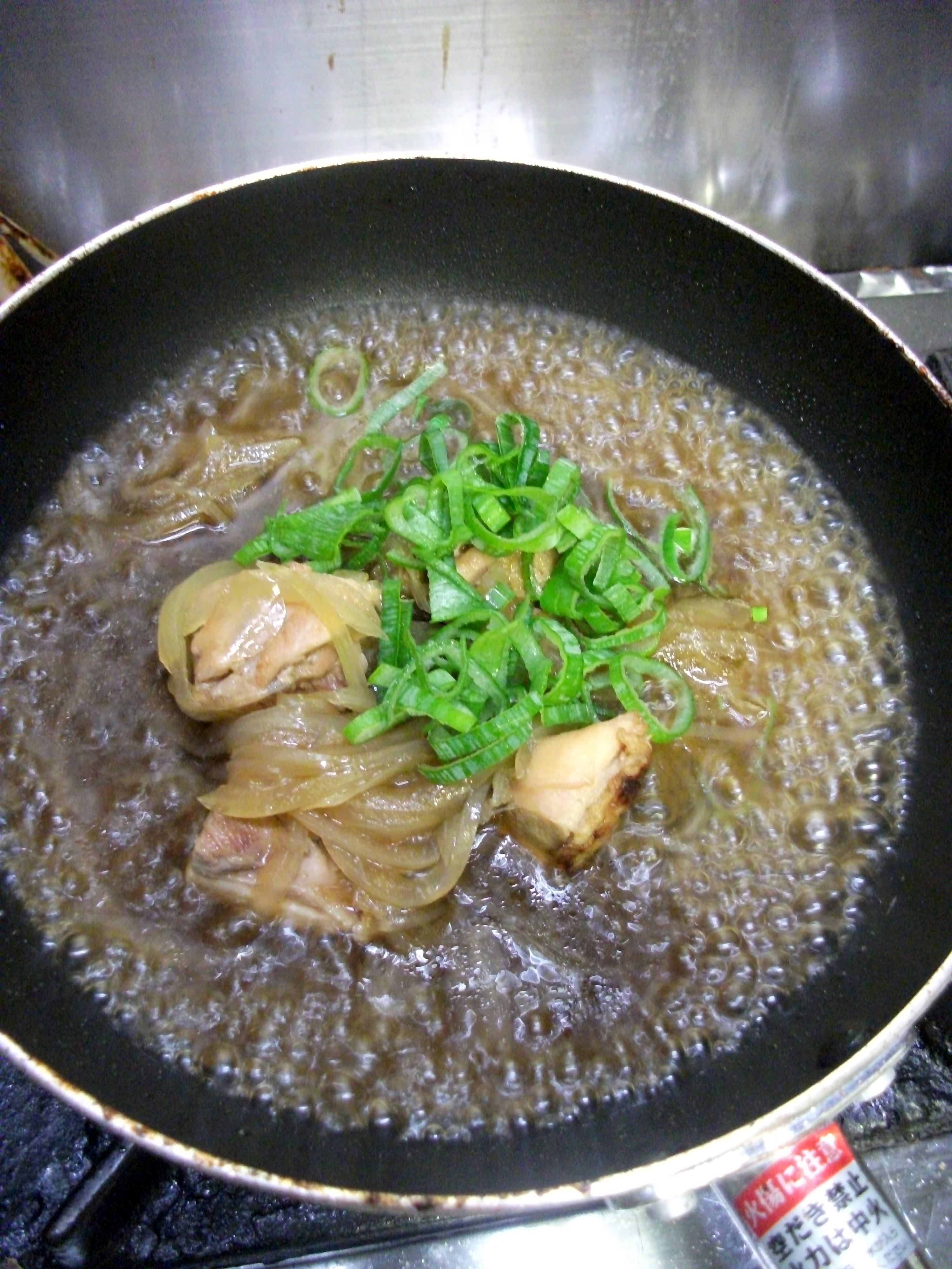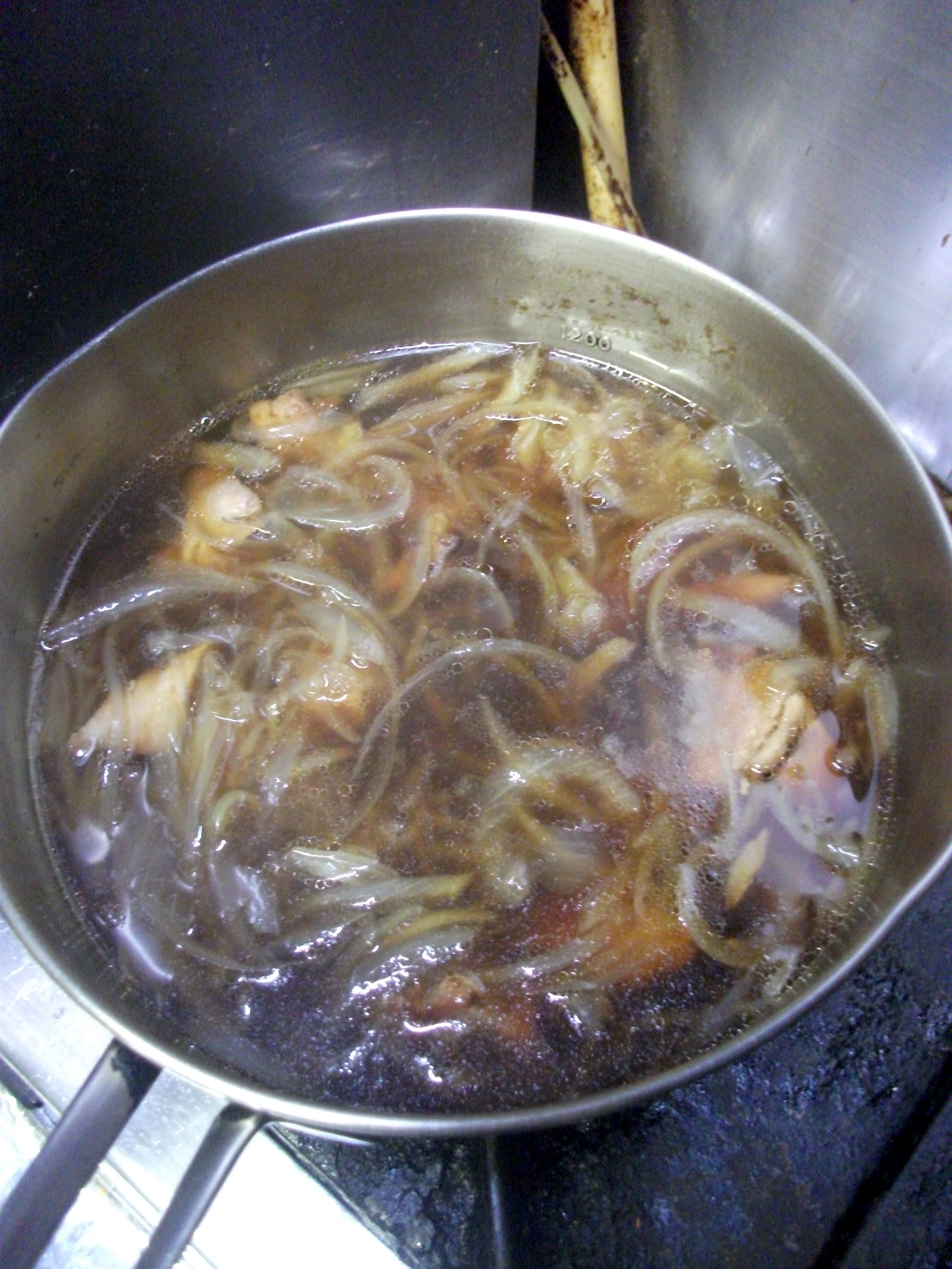 2. In a shallow frying pan heat the mirin, bring it to a boil. Then, add sugar. Bring it to a boil again. Add cut onion and meat.