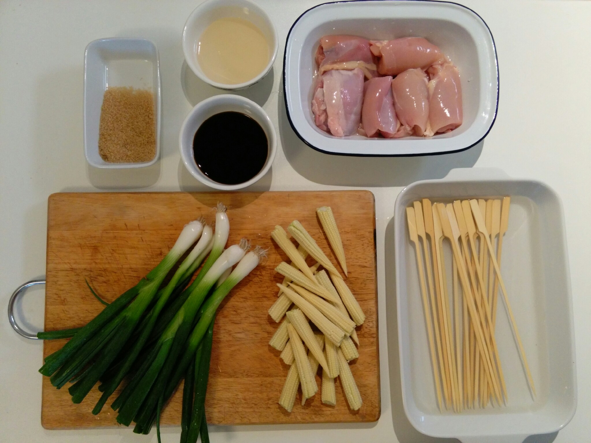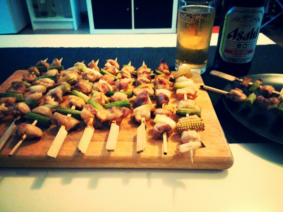 Yakitori translates as grilled chicken, served on a skewer. There are quite a few kinds of yakitori, the one I made at home is bite-sized pieces of chicken thighs with scallions.