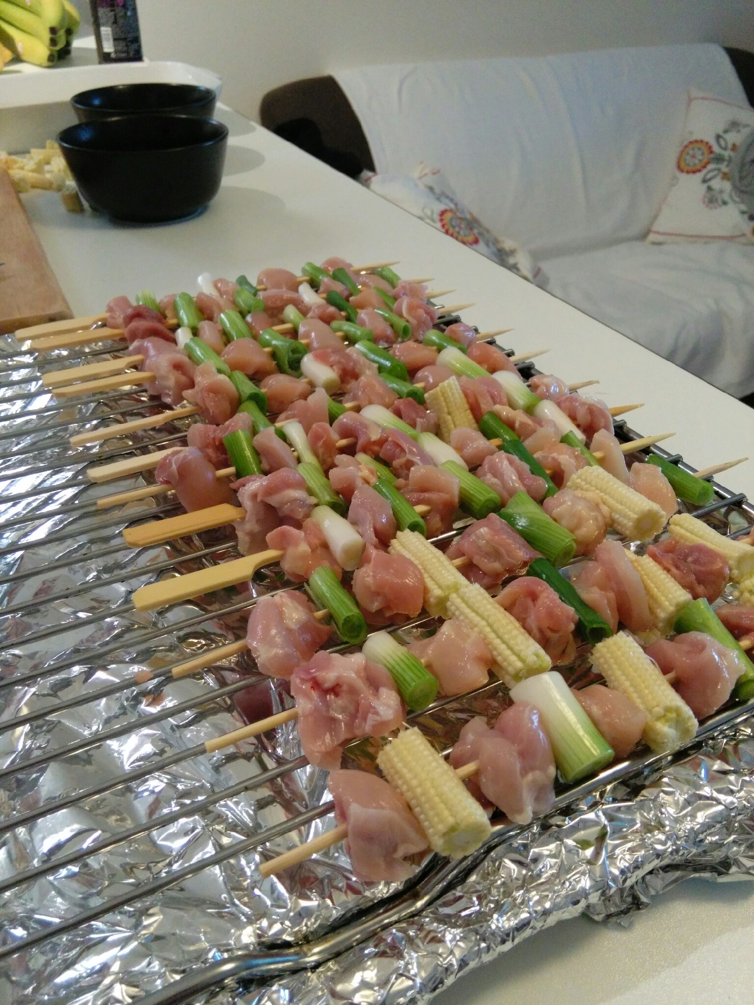 6. After each chicken piece, put a piece of scallion on the skewer. Grease an oven tray with some oil (to prevent skewers sticking to it while grilling) and place your prepared skewers on top.