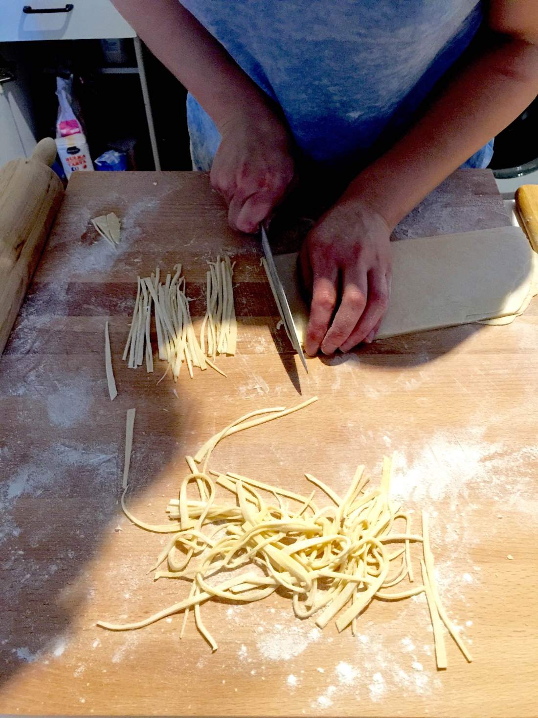 4. Cut it into strips – the wider the strips, the longer the pasta will be (keep in mind it is really difficult to cut the dough into thin strips, so it is probably easier for you to make the strips narrower). You can stack your strips up to 3 high and cut them altogether.