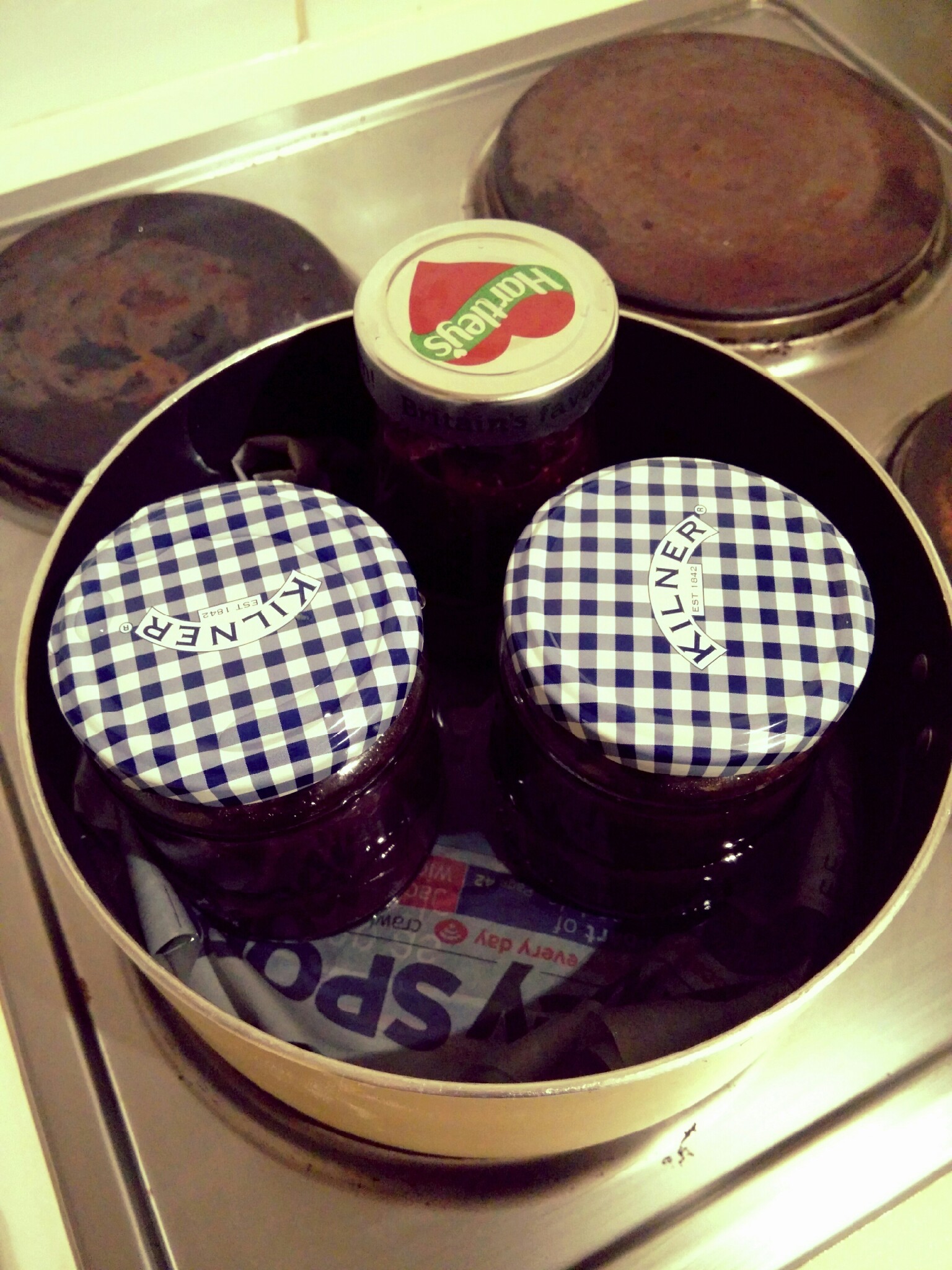 7. My mum’s way: take a big and quite deep saucepan. Place a cloth or (if you don’t have one) some newspaper on the bottom and place the jars on it. Allow some room between the jars so the water can easily flow between them. Add boiling water to the saucepan, almost covering the jars (about 3cm from the top of the highest jar, that’s why you should pasteurise jars of the same height). Let the water boil for about 10-30min. Take the jars out of the boiling water and place them upside down on the flat surface covered with a towel and leave for few hours (or for a whole night).
