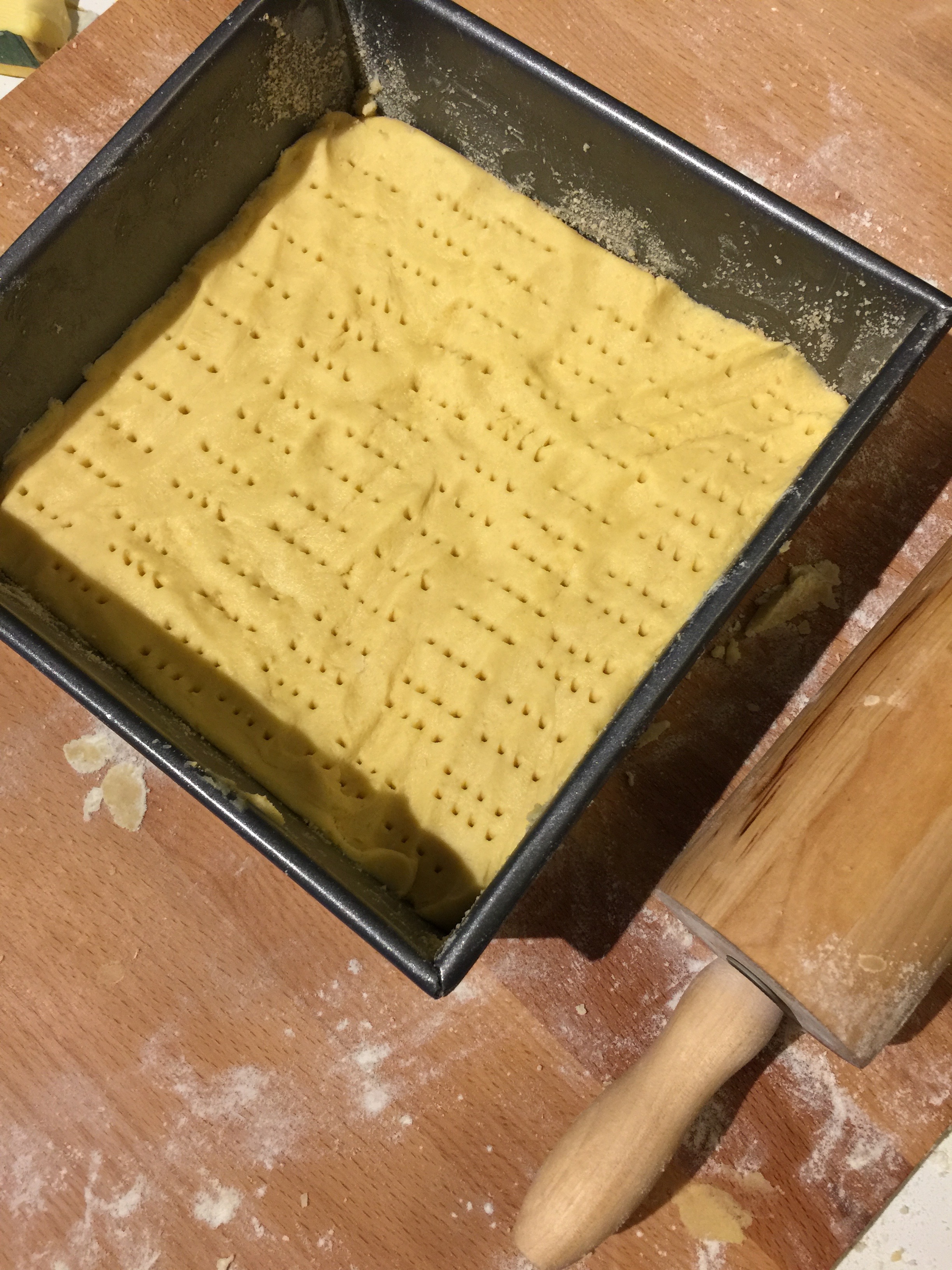 2. Roll the dough out and move it into a greased with butter form (26x36cm). Make holes in a dough with a fork. Preheat the oven to 170 degrees. Bake for 20 minutes, until golden colour.