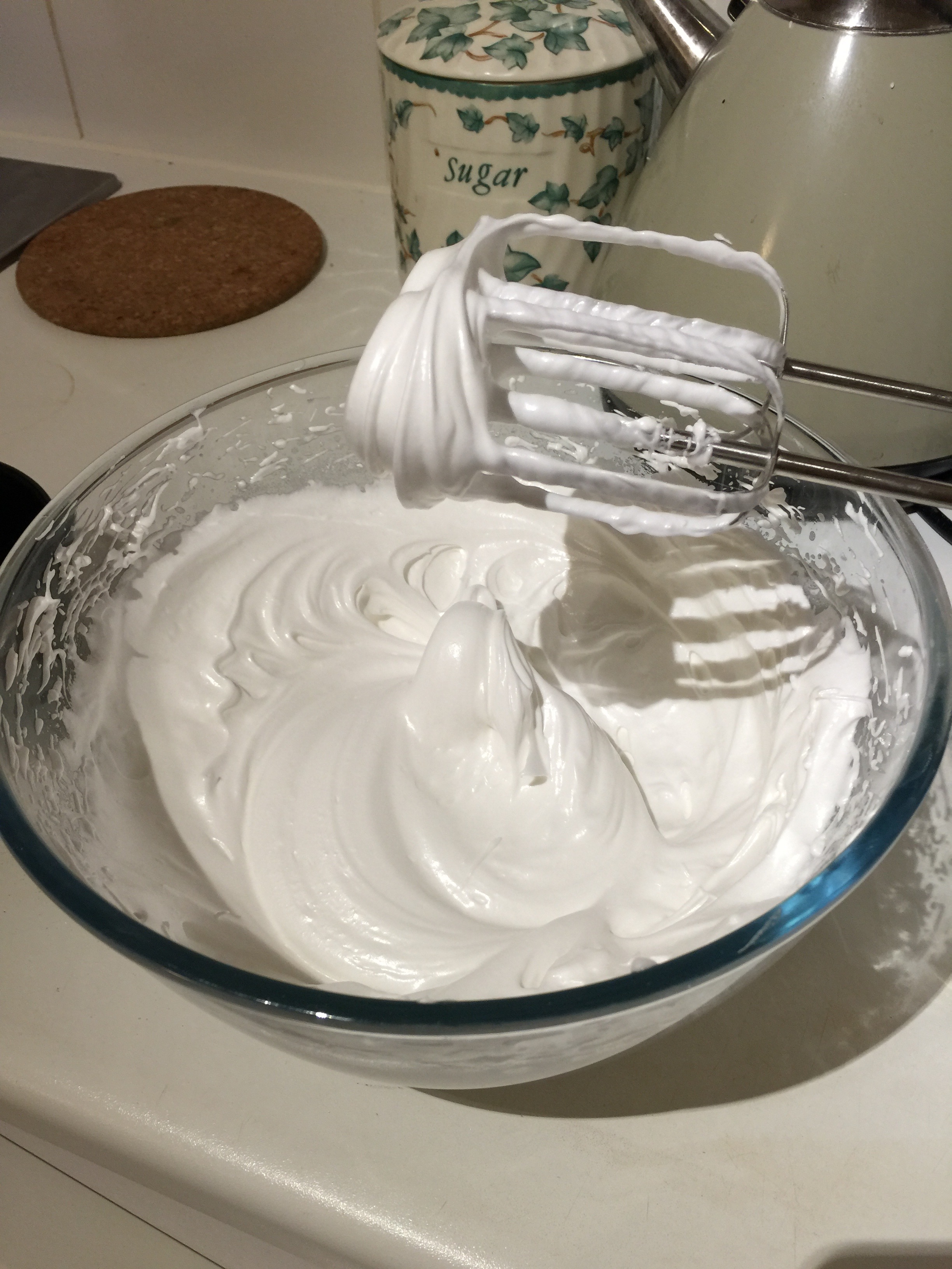 4. Beat the egg whites with an electric mixer until you get a firm foam. Keep beating the eggs, gradually adding sugar, for about 5 more minutes. You should get a thick and glossy mixture. At the end add the potato starch and mix again quickly.