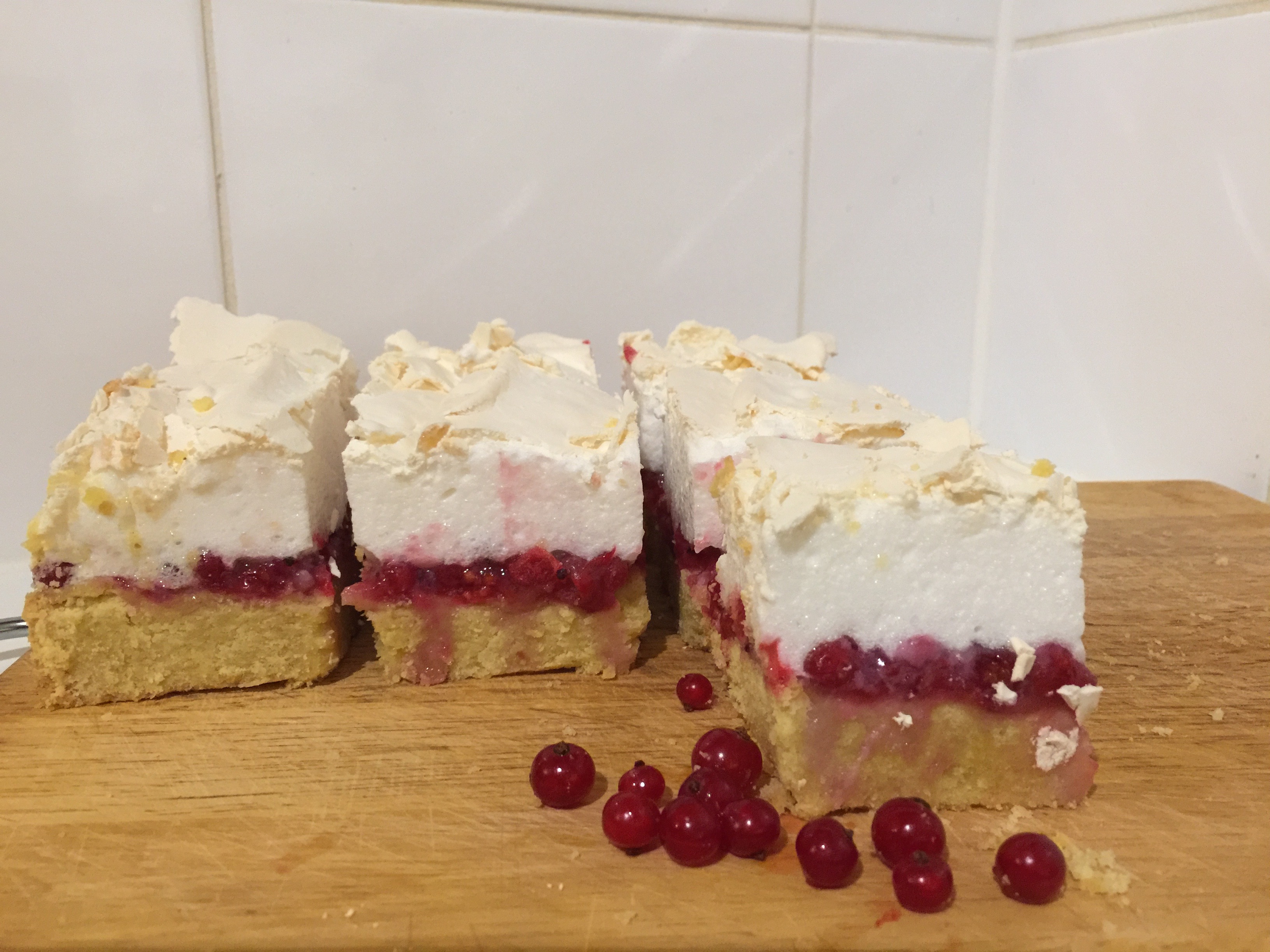 5. Spread the redcurrants on the half-baked cake bottom. Add the meringue mixture on top of the fruit, spreading evenly.