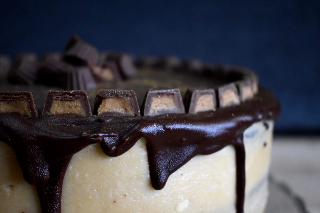 7. Add some mini Reese’s Peanut Butter Cups on top of the cake and pour a bit of ganache over it. Cut big Reese’s Peanut Butter Cups in half and assemble them around the bottom of the cake. Seems like you have done it!