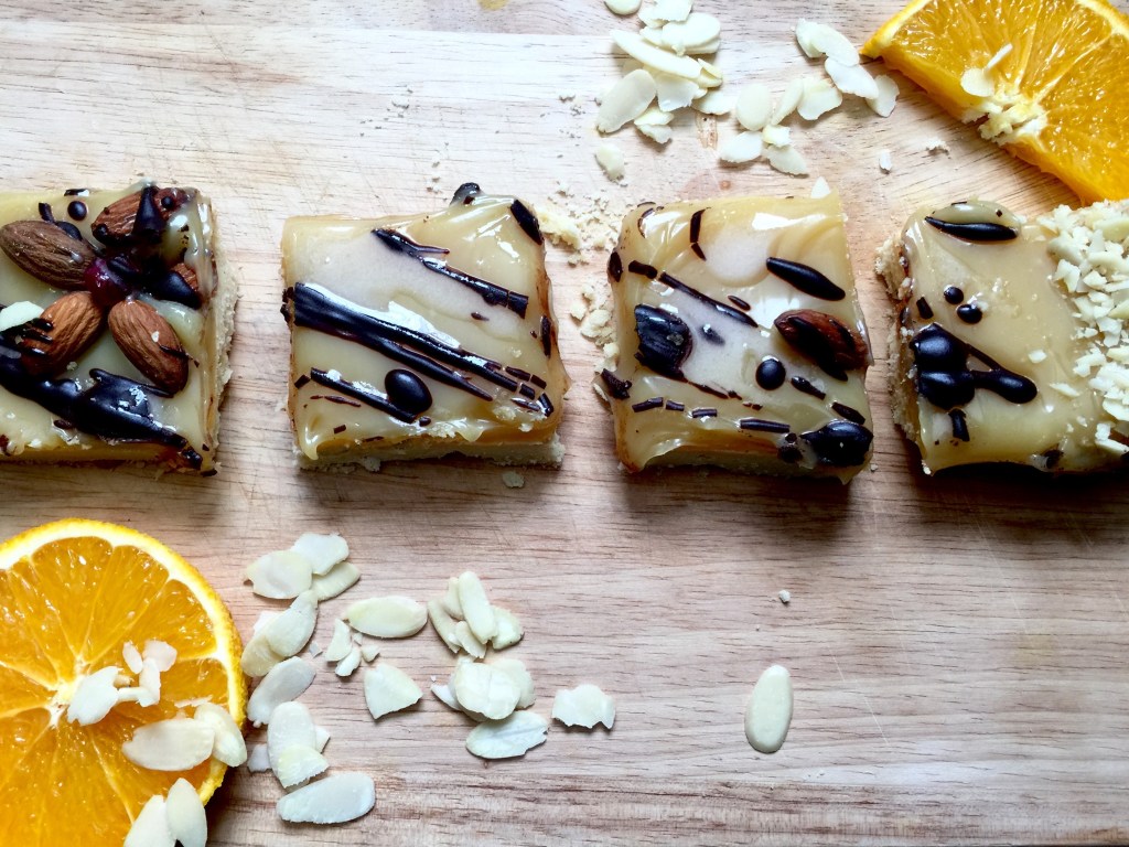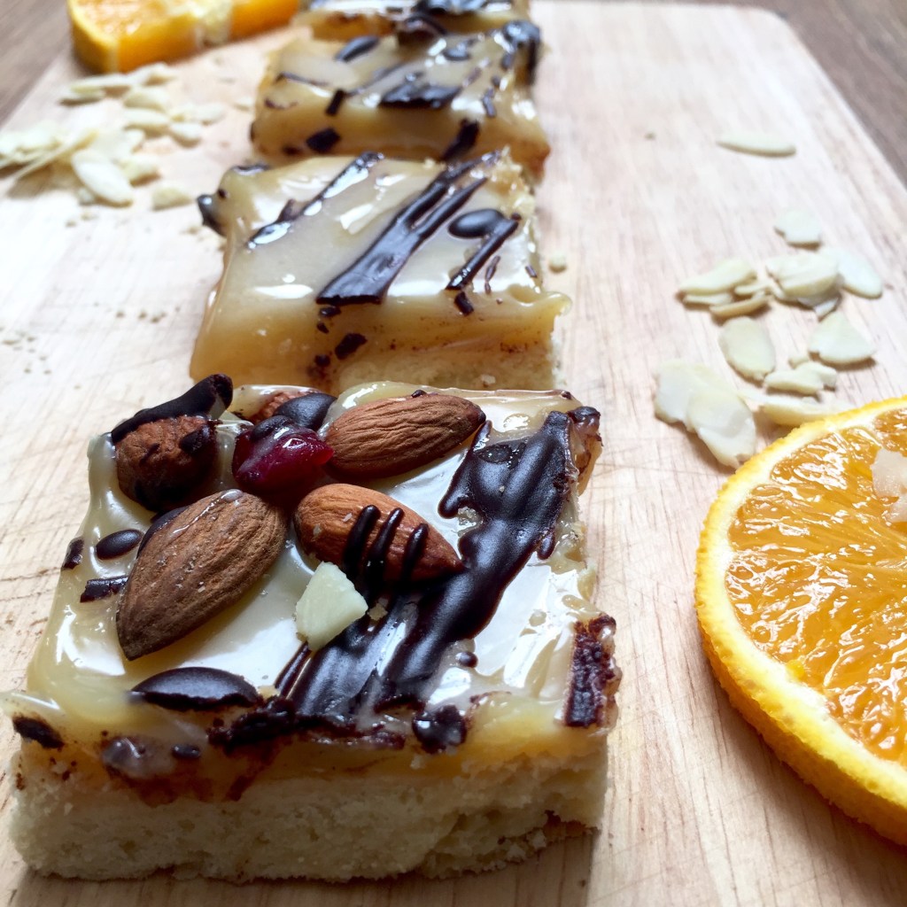 Mazurek is a Polish traditional Easter cake, very sweet and with lots of delicacies: raisins, almonds, walnuts, dried cranberry or apricot. There are many versions of mazurek, I made probably the sweetest one. Mazurek Kajmakowy, which is simply shortcake base with a layer of fudge-like, caramel layer on top. Decorated with almonds, chocolate, dried cranberries. Simple, very, very sweet treat.