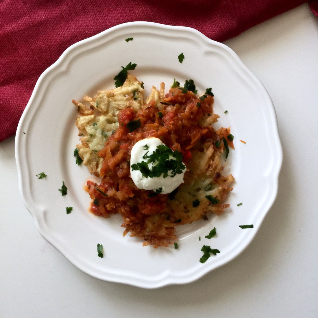 POTATO FRITTERS WITH VEGETABLE SAUCE (PLACKI ZIEMNIACZANE Z SOSEM WARZYWNYM)