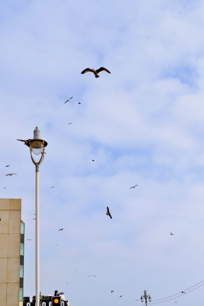 Nonetheless, in a town like Brighton, a famous seaside resort nestled on the south coast of England that attracts tourists not only from within the UK but also from many other corners of the world, the seagulls are everywhere, silently watching or noisily making their presence acknowledged. You see them flying in groups, crying loudly as if they were trying to claim the territory for themselves. It would be difficult to imagine the city without them. And sure enough, they can be noisy, dirty and intimidating, potentially dangerous even, but that doesn’t mean they are evil and to be gotten rid of. It’s a combination of factors, that they have become so difficult to manage. I can’t help but wonder: if it wasn’t for people, providing a never-ending supply of food waste, overflowing rubbish bins, who knows if the birds would have ever converted to a junk-food diet? And although the situation is not as bad as Banksy imagined in his artwork, it’s sometimes easy to picture things ‘going south’ indeed. Solution? How about we stop feeding the seagulls with our food and manage our food waste properly, instead of blaming the birds for all the damage? Just a thought.