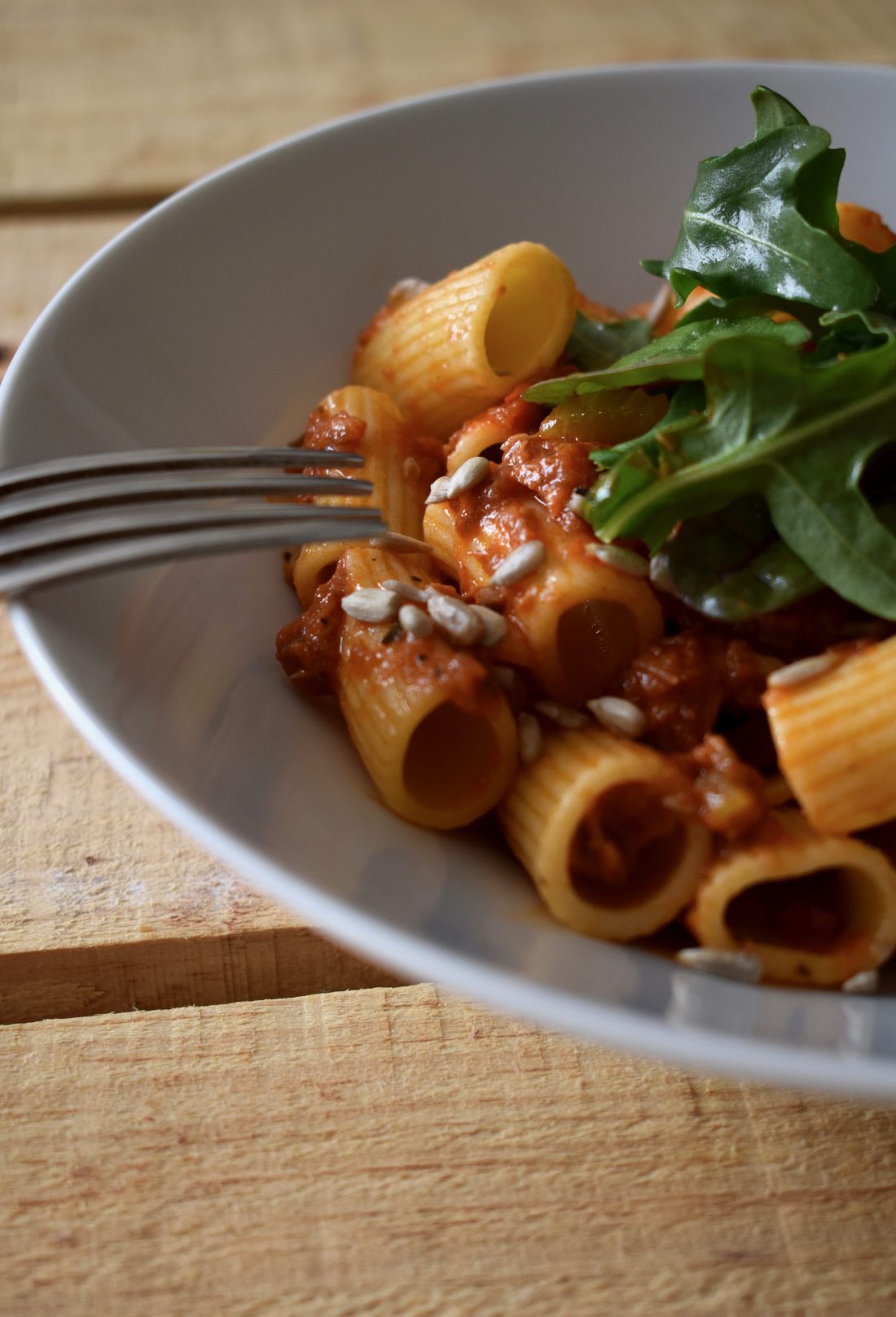8. Mix boiled pasta with the sauce. Served with fresh rocket and a handful of sunflower seeds. Add grated parmesan if you wish.
