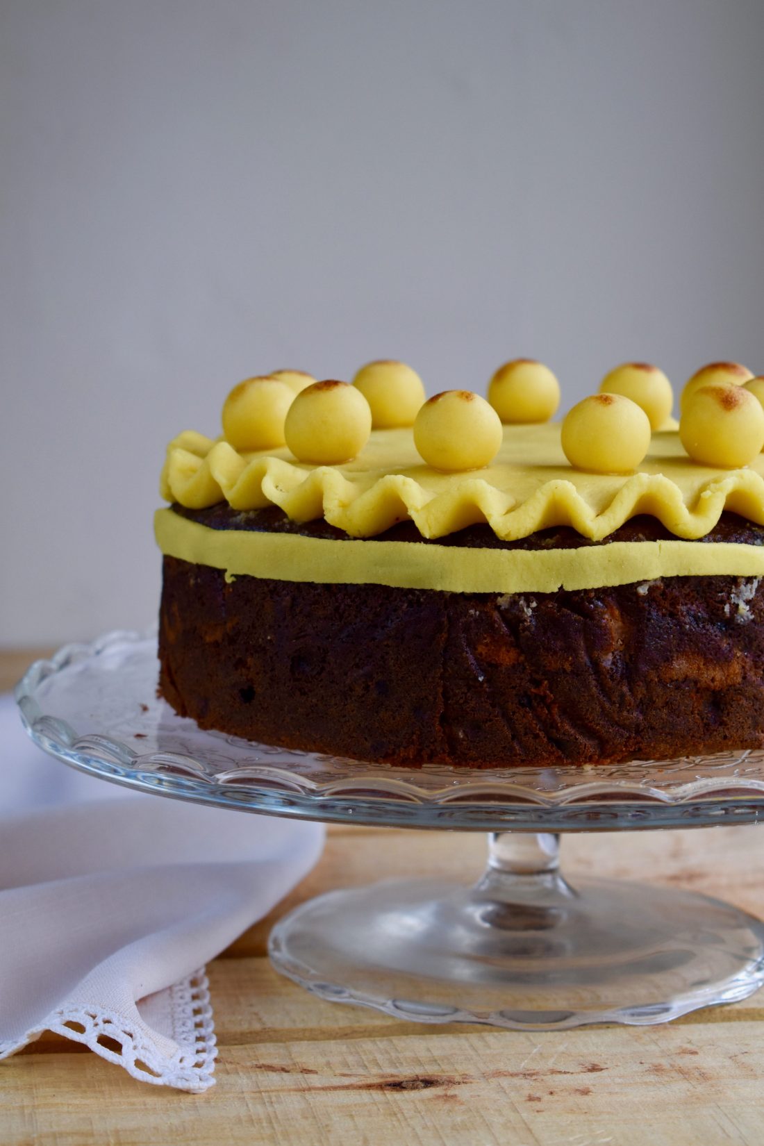 10. Place the whole, decorated cake under the hot grill to add the golden colour to the marzipan balls. But that’s only the option for those who have a trustworthy, working grill. If you’re not the lucky one (I am), do not try to get the golden marzipan colour in an hot oven. That will melt the marzipan, which will then run down the cake. It doesn’t look pretty (yes, I saw it). It is much more advisable to use a kitchen blow torch or even a lighter, to add this beautiful golden touch to the marzipan balls.