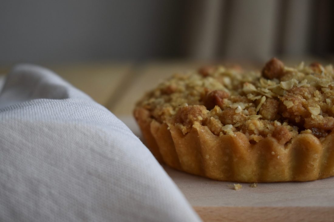 6. Spoon the apple filling into the pastry cases, add the crumble on top, covering the apples completely. Lastly, sprinkle the top of the crumble with some oats.
