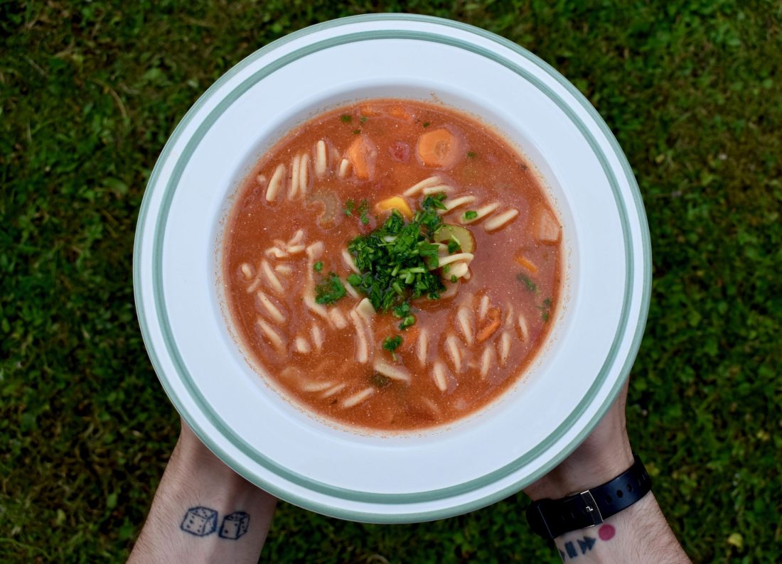 Chunky, fresh, and very satisfying. This tomato soup with pasta is as comforting as summer gets.