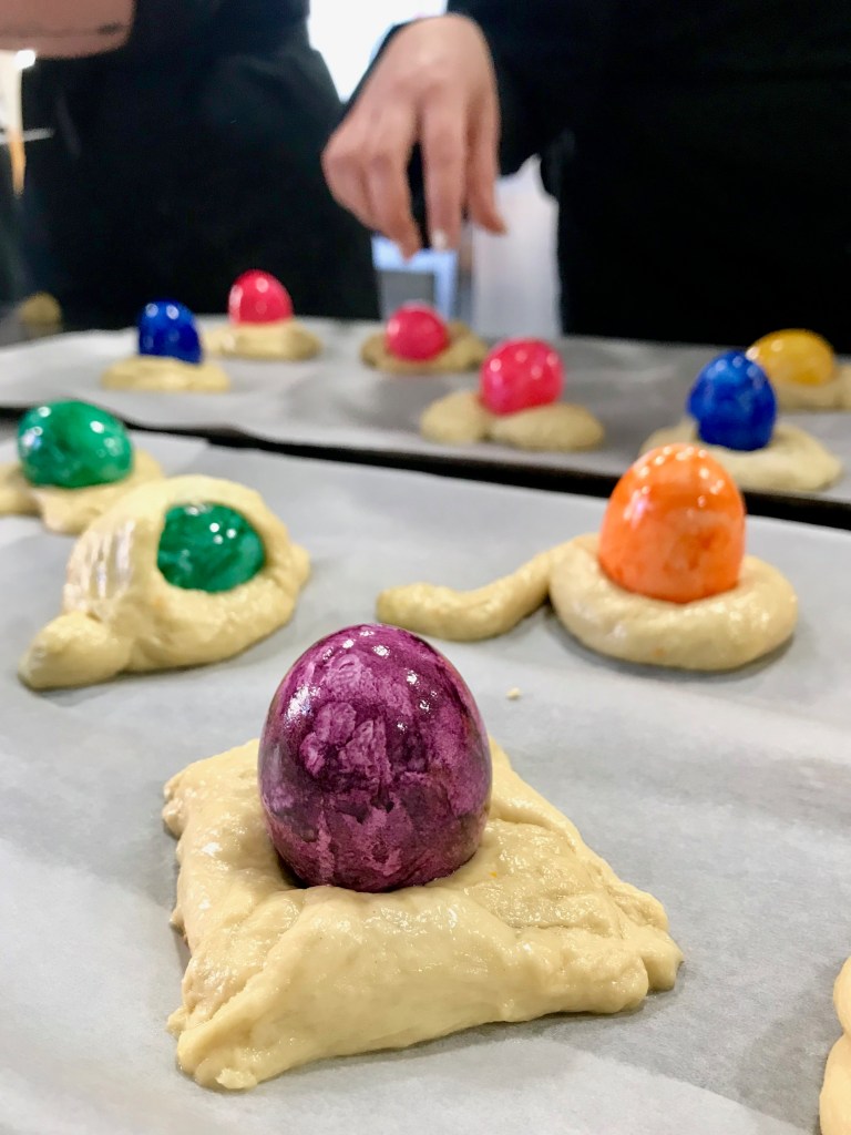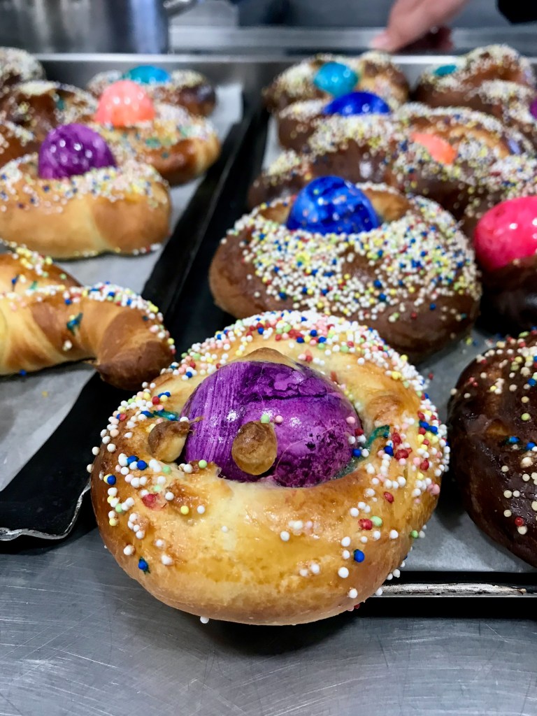 Traditionally, eggs were not considered fasting food and hence were not eaten during Lent. They were often hard-boiled, in order to be able to preserve them for longer. Colourful eggs featured in monas de pascua indicate the end of fast and beginning of celebration. On Easter Monday, monas are offered by godparents to their godchildren, and in the past they used to have as many eggs as the age of a child was. Now, the eggs are often replaced with chocolate ones, and the pastry, too, gets replaced with much lighter sponge. Monas the Pascua are still a pretty big part of the local culinary tradition, however, and they appear in bakeries and supermarkets good few days before Easter.