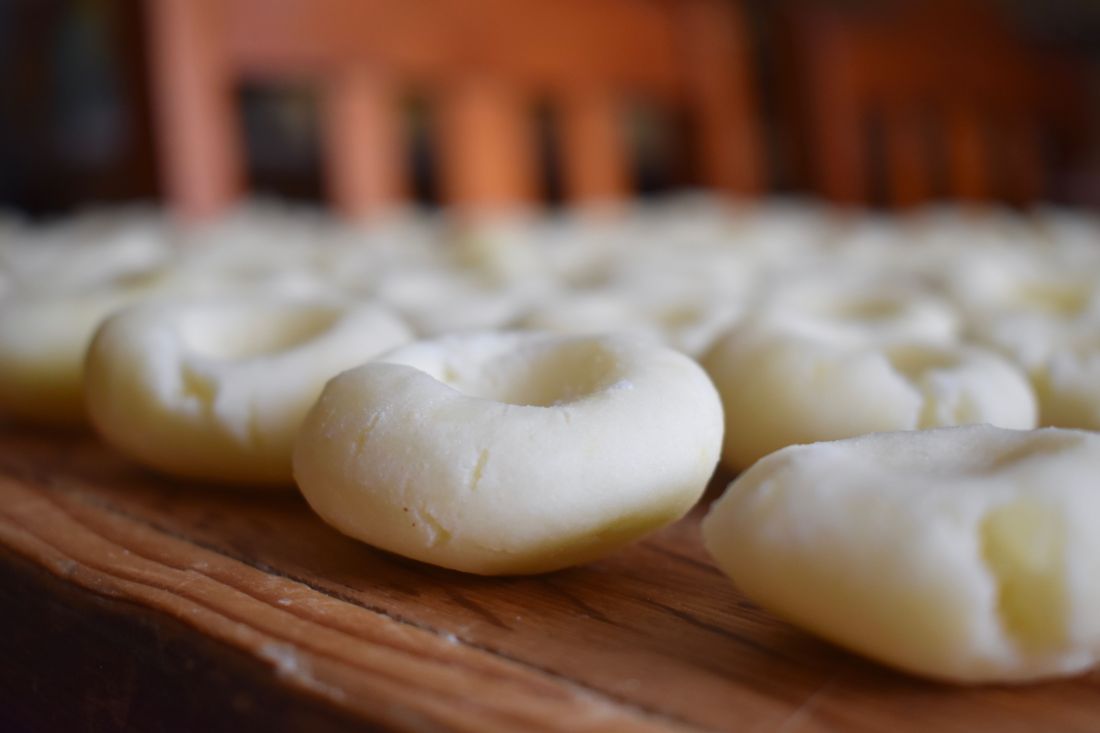 4. Take a walnut-sized piece of kneaded potato dough and form it into a little ball with your hands. Flatten the ball slightly and make a small hole in the middle with your finger or the end of a wooden spoon. Line ready dumplings on a board sprinkled with potato starch.