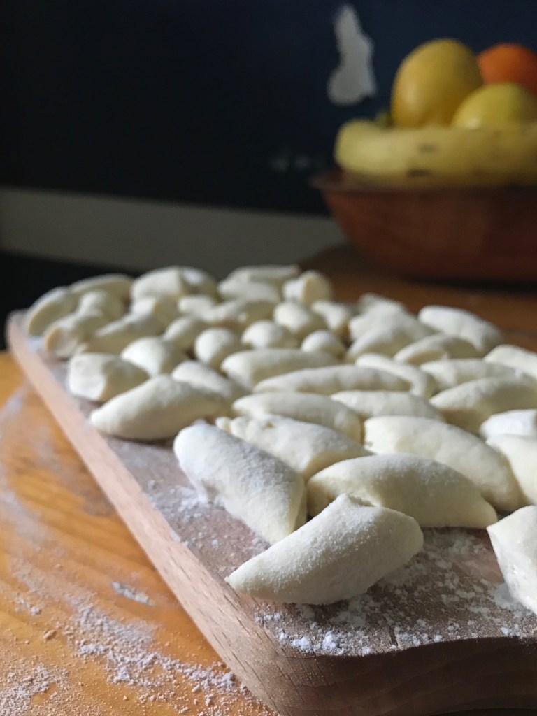 As for technicalities: there are two kinds of dumplings in Poland that look exactly the same, but the difference between them is quite fundamental – one kind is savoury, another one sweet. The sweet version is, of course, leniwe. The savoury ones are called kopytka (meaning ‘little hooves’ in Polish) and are made with boiled mashed potatoes instead of the quark cheese used in leniwe. And to make things even more confusing: kopytka are not the same thing as kluski śląskie, even though they are both dumplings made with potatoes.