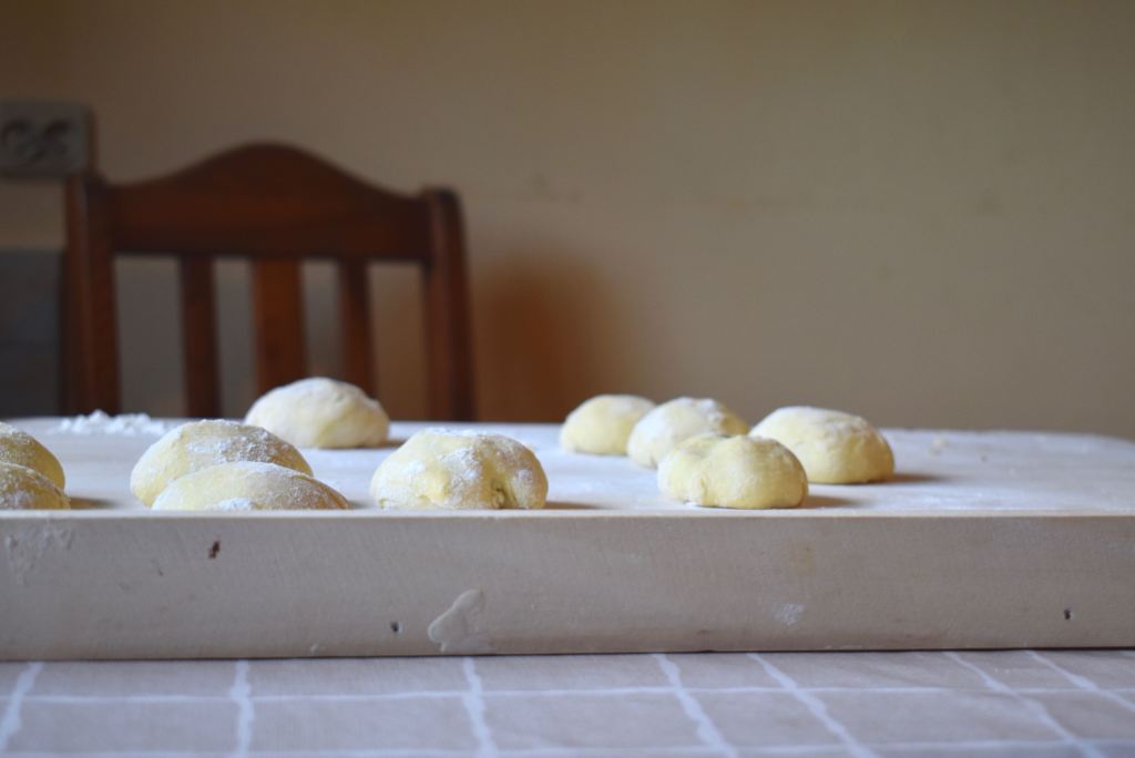 5. Take each of circles and place about a teaspoon of filling in the middle. Gather the edges together and stick tightly. Form into a ball and set aside on a floured surface. Repeat with all the circles. When done, cover with a cloth and let them rise a bit once again.