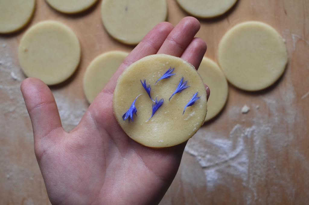 two hands holding ready to bake shortbread biscuit with fresh blue cornflower petals