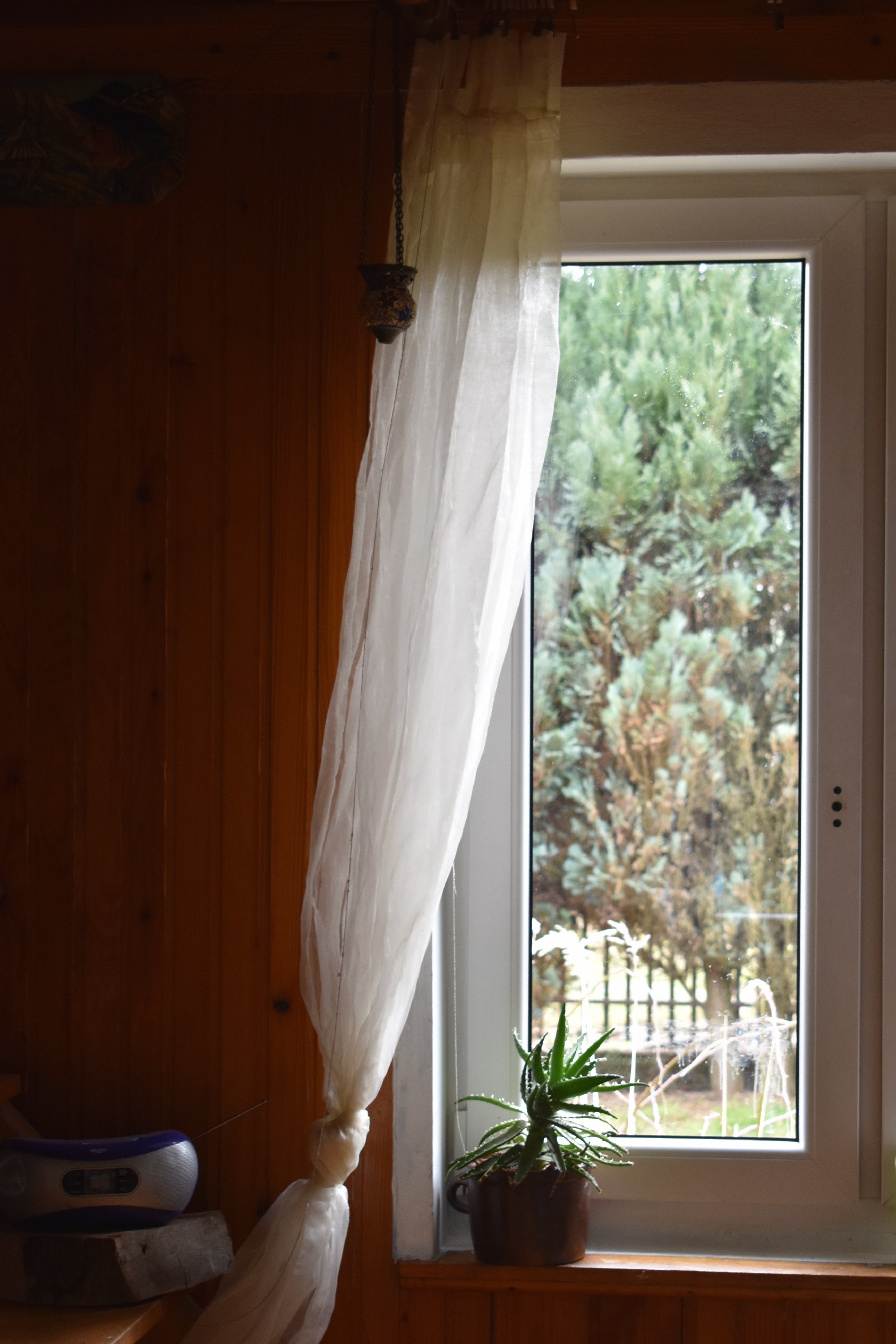 The house is tiny, hidden from the view by thuja bushes. Inside, only one room: a study and a kitchen, with a mezzanine mini-bedroom that gets way too hot in the evening, constantly heated by the warmth of the fireplace. The floor is wooden, and so are the walls. Two windows on the opposite sides of the room let warm, flickering sun rays into space. I like to watch them dance gracefully on the floor.